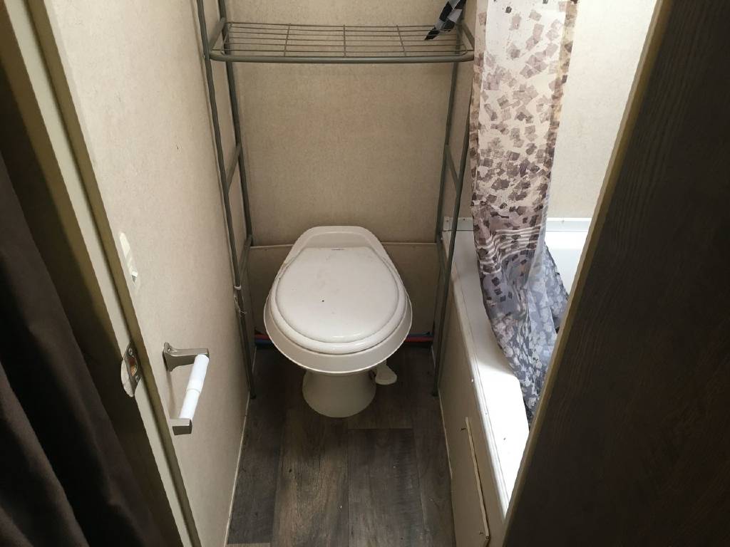 The front of the trailer is dedicated to the bedroom, which includes a queen-sized bed, two wardrobes, and overhead cabinets for storage. The bathroom is located adjacent to the bedroom and includes a shower, toilet, sink, and medicine cabinet.