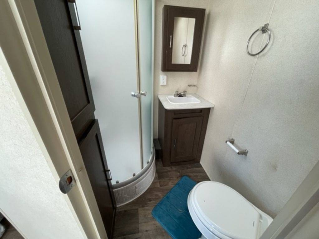 The front of the trailer is dedicated to the bedroom, which includes a queen-sized bed, two wardrobes, and overhead cabinets for storage. The bathroom is located adjacent to the bedroom and includes a shower, toilet, sink, and medicine cabinet.