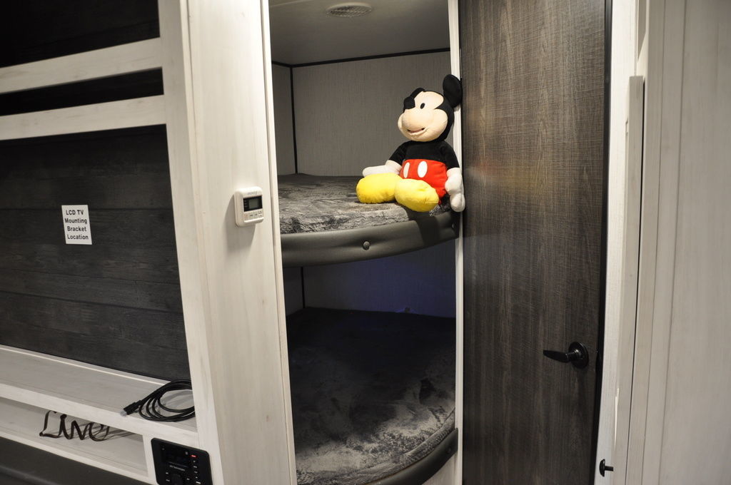 The 261BHS floor plan features a rear bunkhouse, which includes double bunk beds and a wardrobe for storage. The dining and living areas are located in the central part of the trailer, with a U-shaped dinette and a sofa that can be converted into a bed. The entertainment center includes a TV and a DVD player.