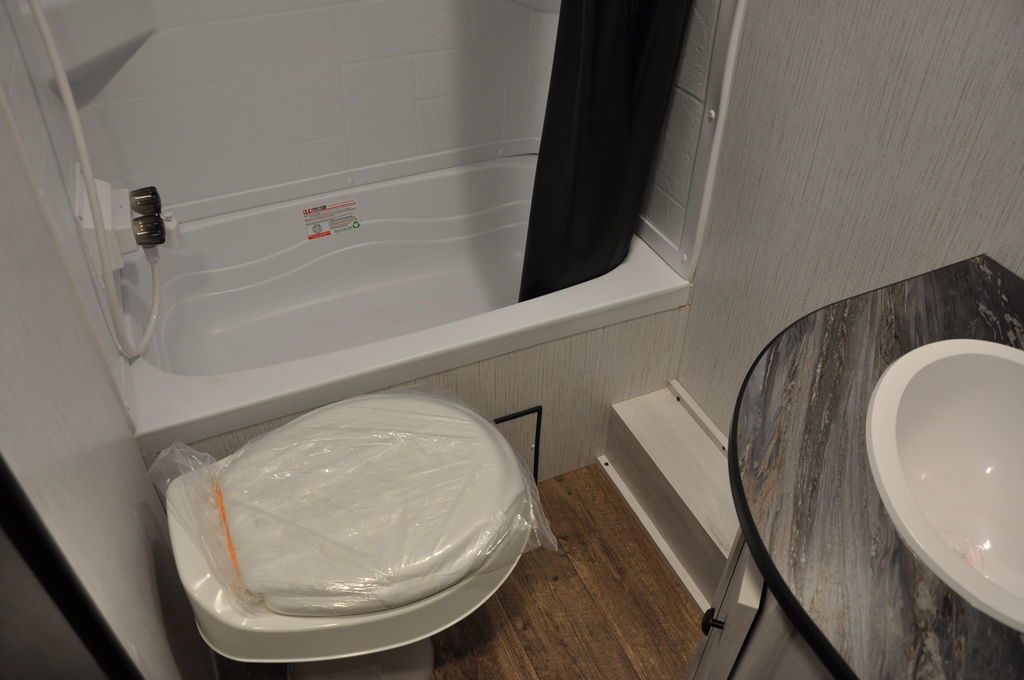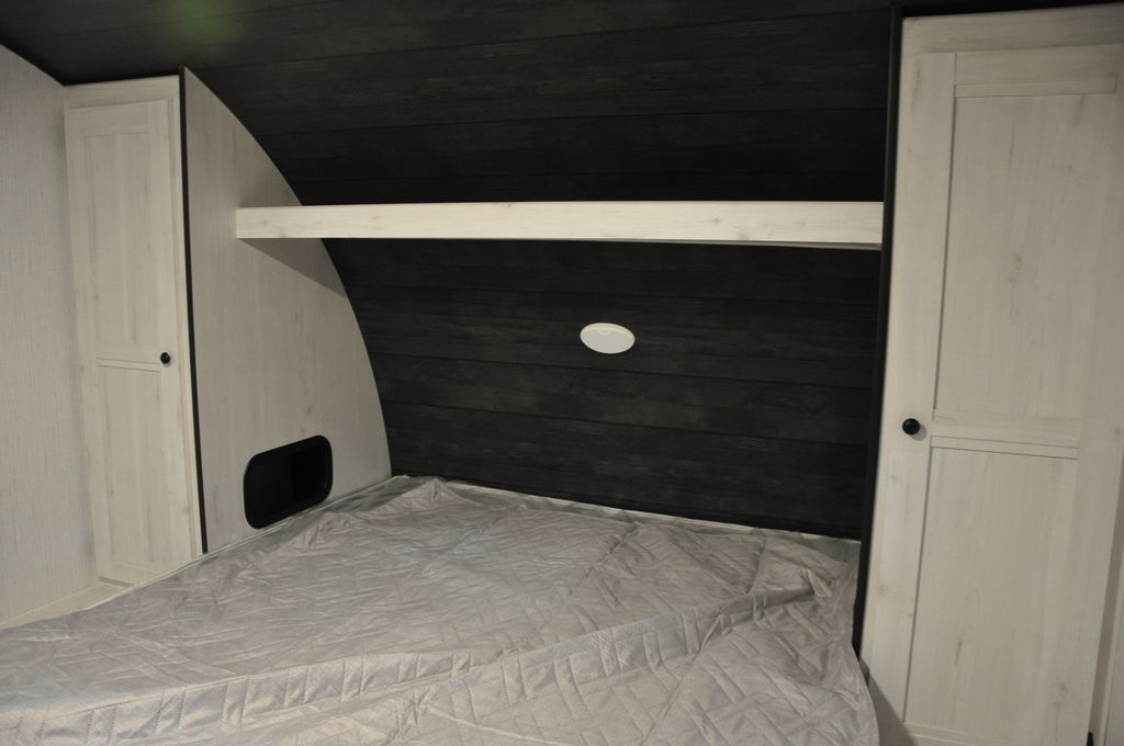 The front of the trailer is dedicated to the bedroom, which includes a queen-sized bed, two wardrobes, and overhead cabinets for storage. The bathroom is located adjacent to the bedroom and includes a shower, toilet, sink, and medicine cabinet.