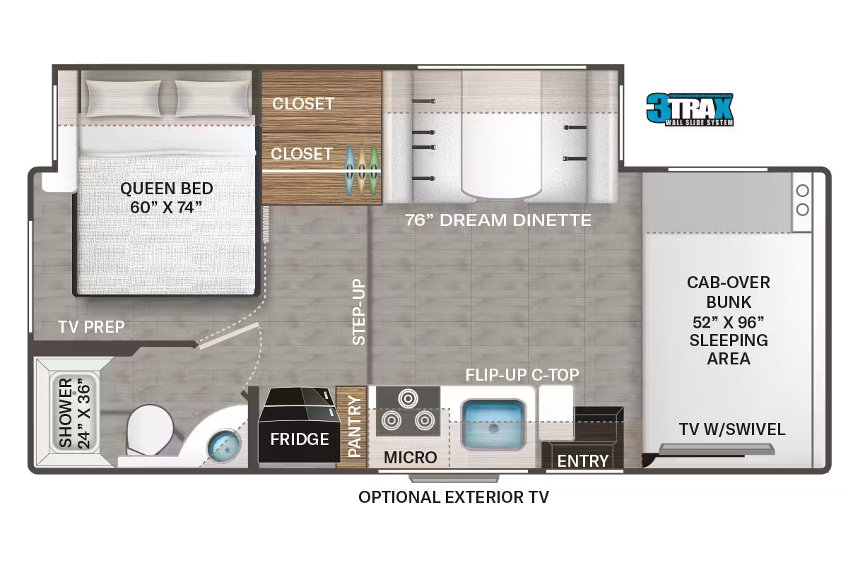 The private rear master bedroom includes a folding RV queen while the large dinette booth converts into a double bed. The cab over queen is oversized and can easily sleep 2 adults.