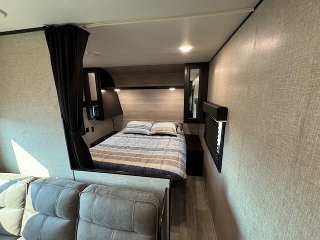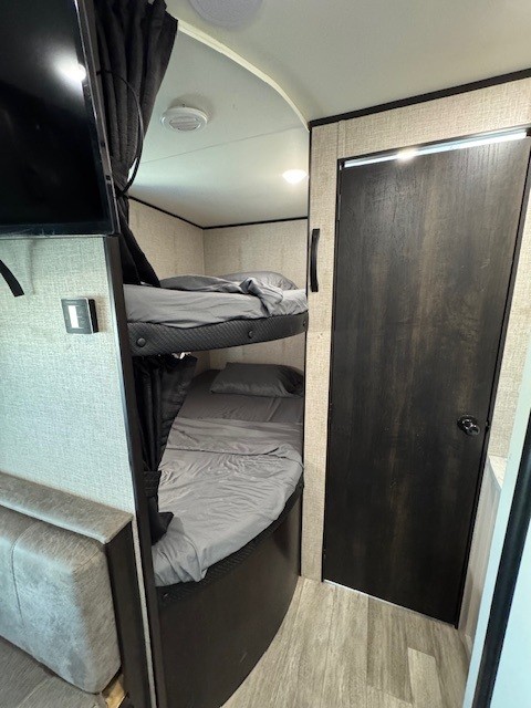 At the rear, you'll discover a convenient bunkhouse that features two oversized bunk beds, providing a personal space for the kids to relax and sleep. The front private bedroom boasts a comfortable queen-sized bed and plentiful storage options, ensuring a restful retreat after a day of outdoor fun.