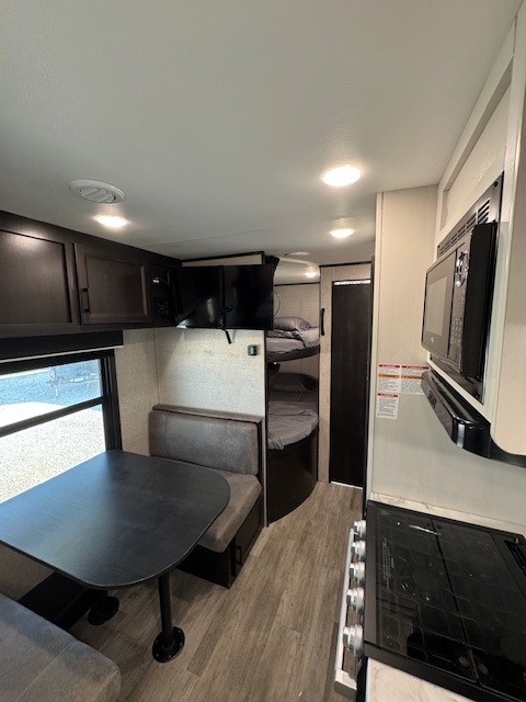 The kitchen is thoughtfully equipped with modern appliances, including a three-burner cooktop, a microwave, and a refrigerator, allowing you to prepare delicious meals on your travels. With generous countertop space and a pantry, you'll have plenty of room for food storage and meal prep.