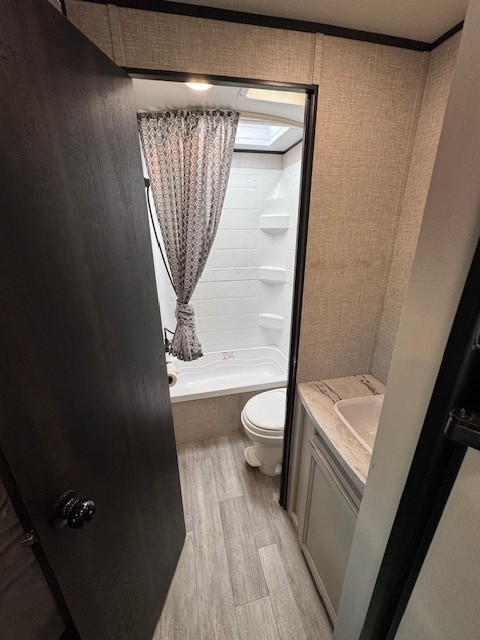 The bathroom is designed for practicality, featuring a shower, toilet, and sink, so you can freshen up with ease. Step outside to enjoy your campsite under the large power awning(not guaranteed), perfect for relaxing in the shade or hosting outdoor meals.
