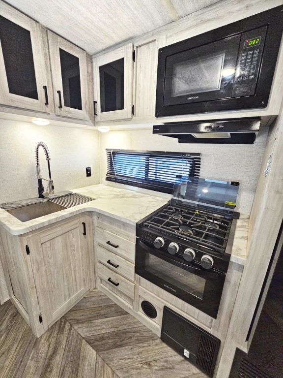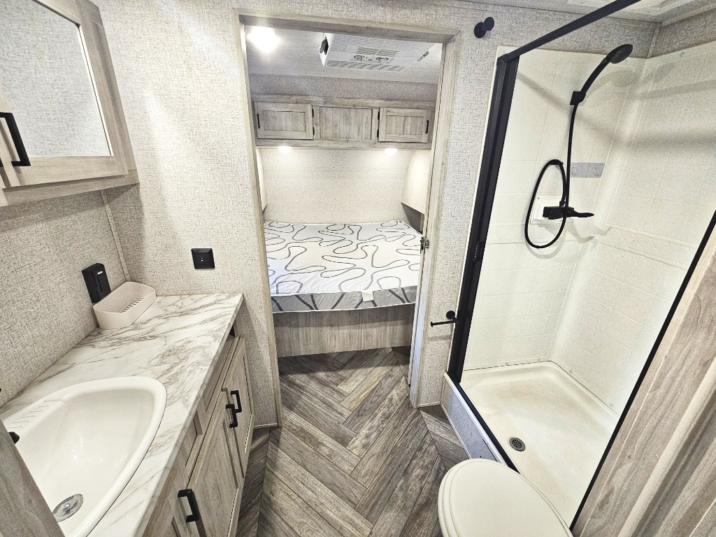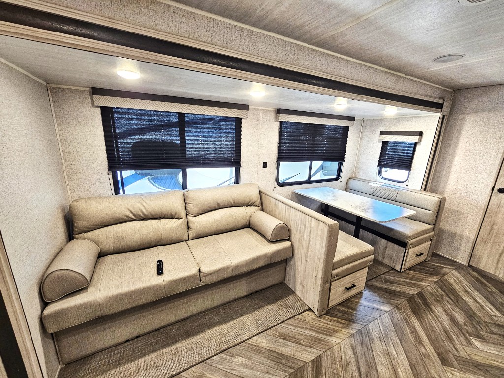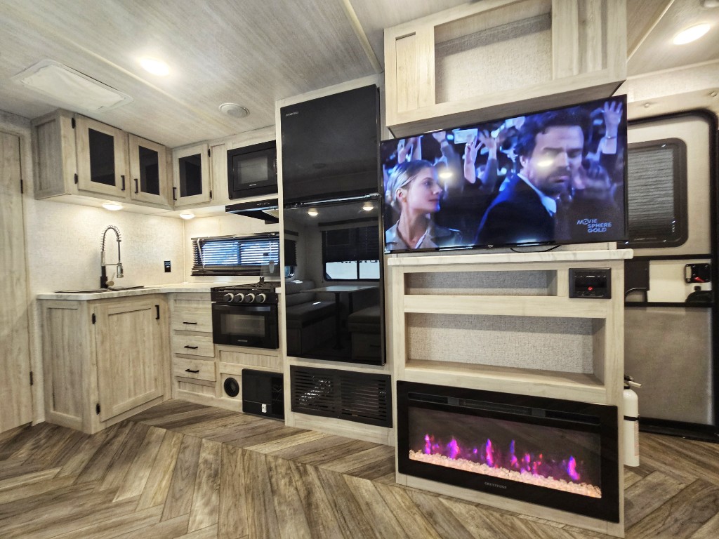 This bunkhouse travel trailer features a private front master bedroom with a walk around king bed, a private rear bunkhouse with four upgraded sleeping areas, a walk-through bathroom, and a living area with an L-shaped kitchen and fireplace.
