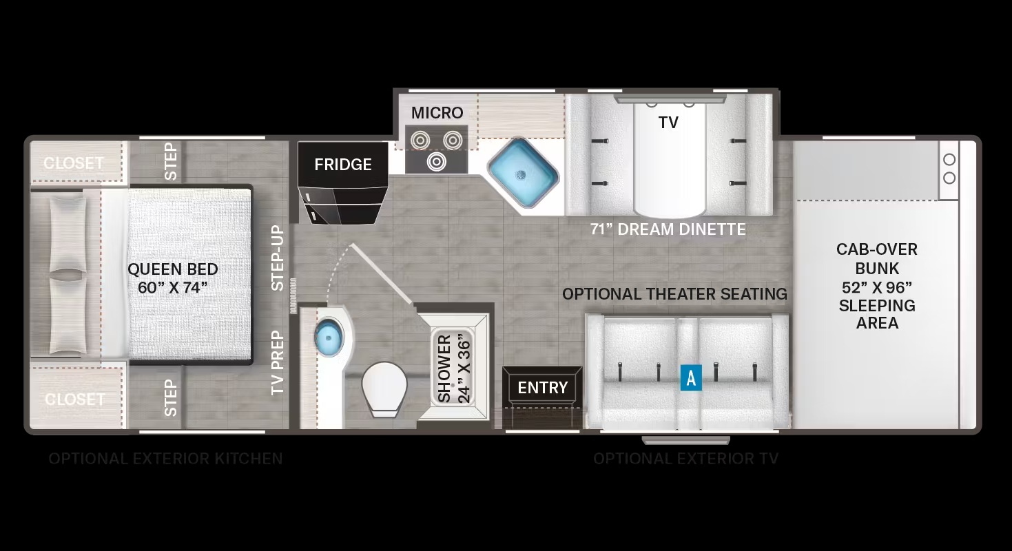The private rear master bedroom includes an island style walk around RV queen while the dinette booth converts into a double bed. The theater seats do not serve as sleepers The cab over queen is oversized and can easily sleep 2 adults.