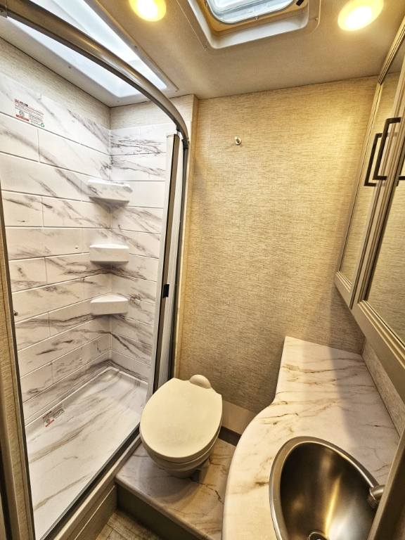 The full kitchen and full restroom are nice inclusions and are fully functional on the road. This particular vehicle offers a full sized RV fridge along with the microwave, 3 burner stove top and gas oven.