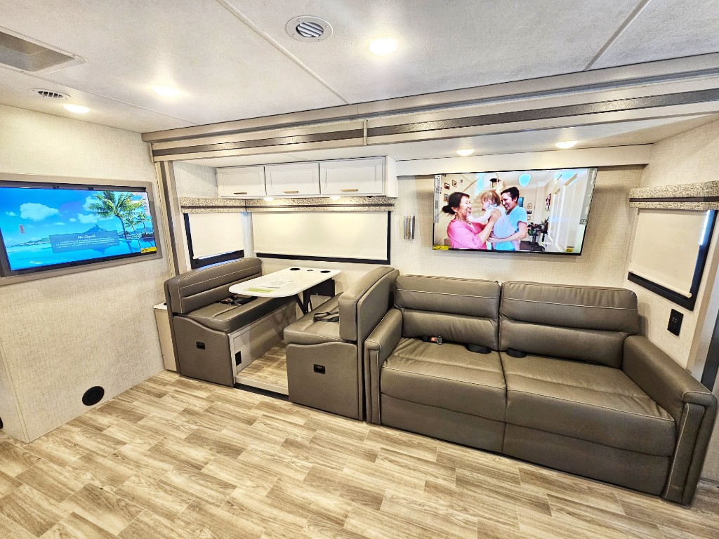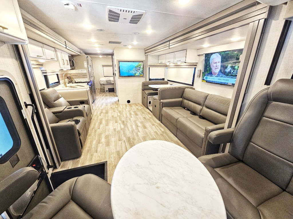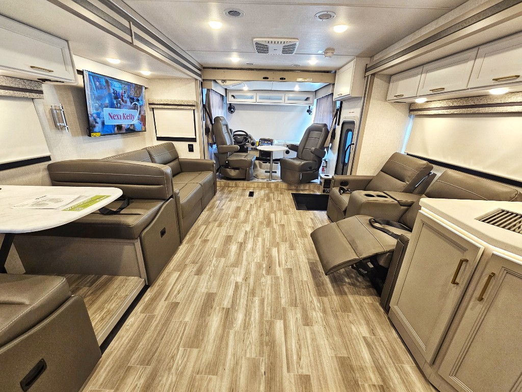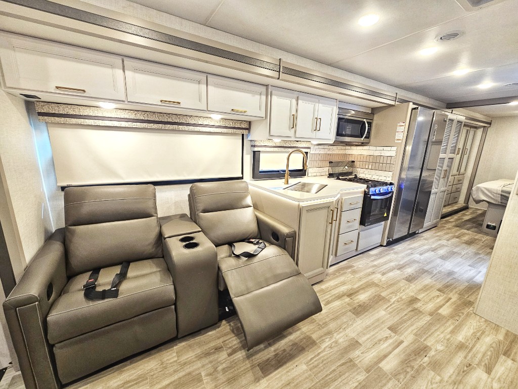 This is one of the largest motor homes we offer with large, opposing double slide outs which create a huge open living area. The residential style refrigerator is a nice touch in the open kitchen.