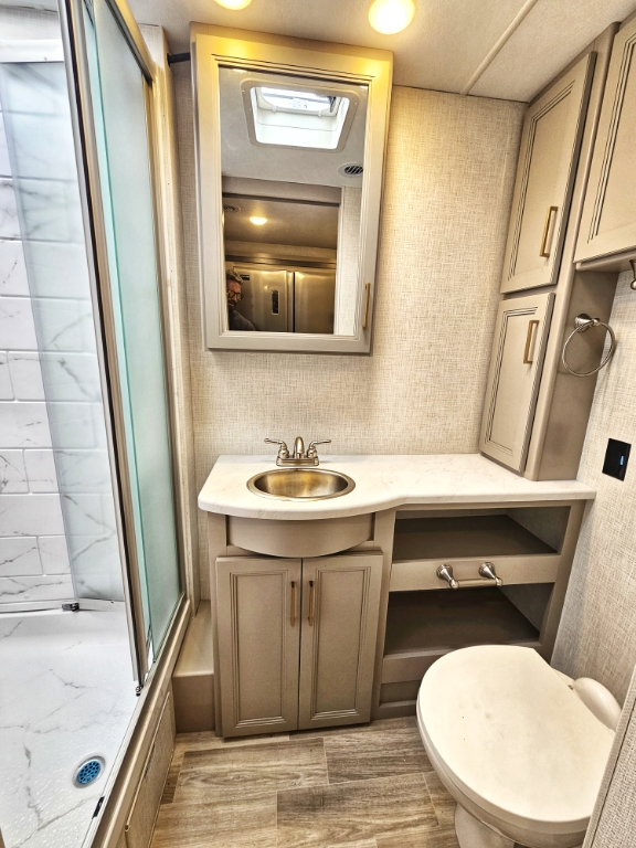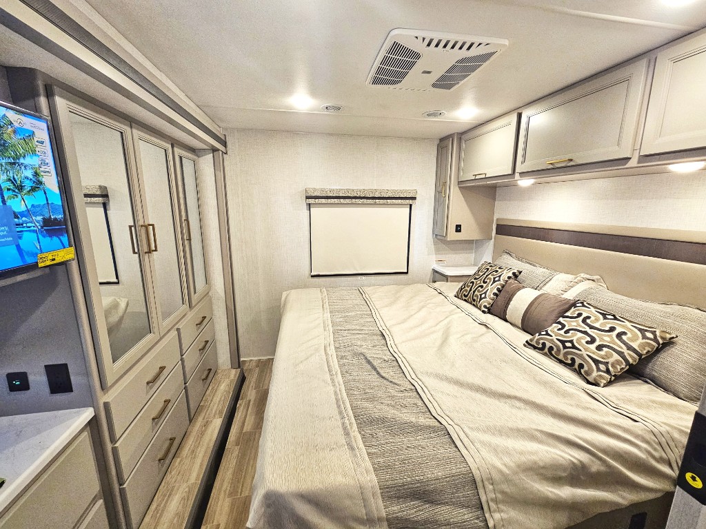 The private rear master bedroom includes an island style walk around RV king. The bathroom is located in the hallway for easy access to all guests.