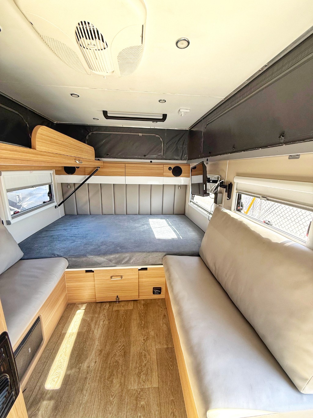 Inside, the intelligently designed layout features a comfortable east-west queen sleeping area and convertible dinette for additional lounging or sleeping flexibility. Large windows and modern finishes give the interior a bright, upscale feel while maintaining durability for real-world adventure. The pop-top expandable roof adds interior height with a single, simple motion.