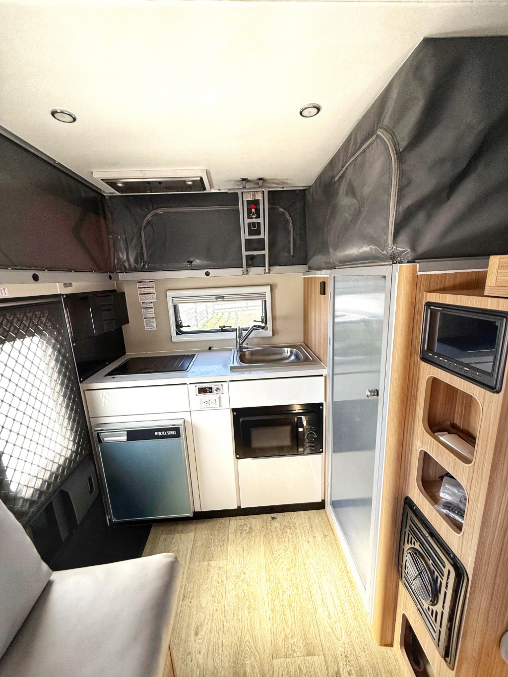The fully equipped interior kitchen includes a refrigerator, microwave, cooktop, sink, and generous prep space. A full wet bath with shower and toilet allows for self-contained travel, making this unit ideal for remote destinations and longer stays off the grid.