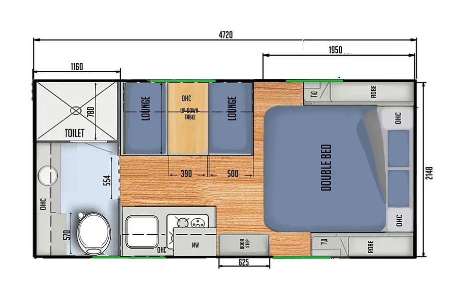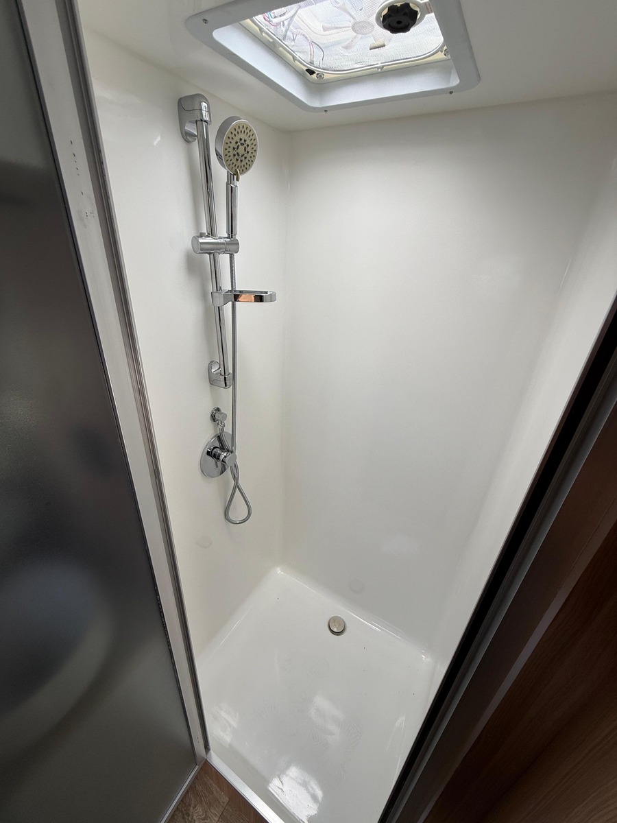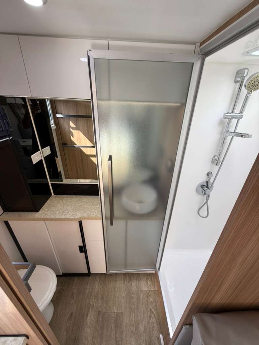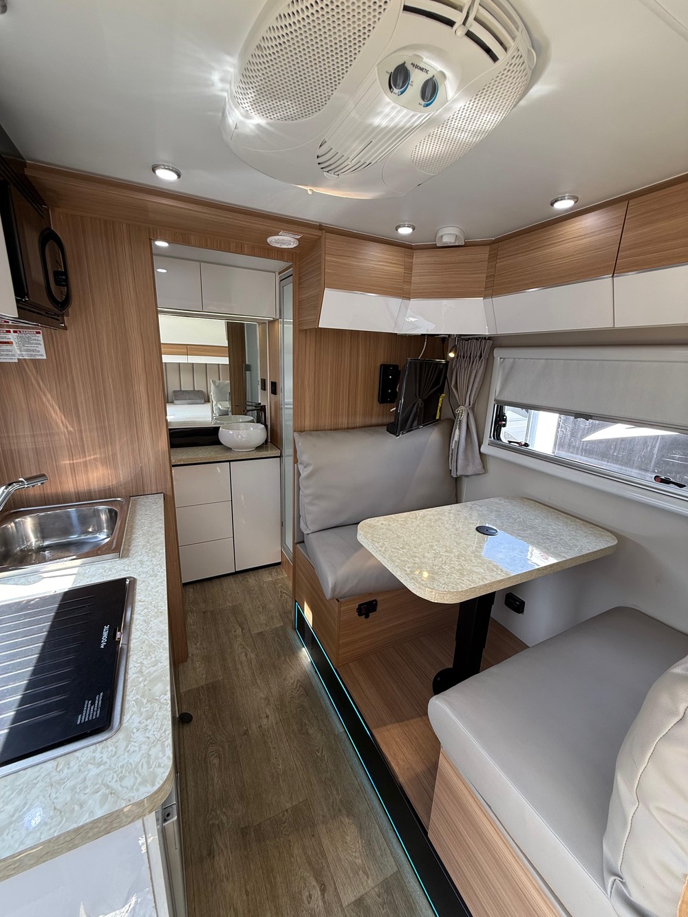 The fully equipped kitchen includes a refrigerator, microwave, cooktop, sink, and generous prep space, making meal preparation easy whether you’re at a campsite or off-grid. A full wet bath with shower and toilet provides self-contained convenience for extended travel and remote destinations.